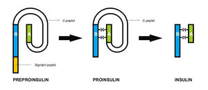 ostrůvků. Samotná tvorba potom probíhá v ribozomech (vznik preprohormonu Preproinzulínu) a v endoplazmatickém retikulu (vznik prohormonu Proinzulínu). Dále se v Golgiho aparátu vytvořený Inzulín s fragmenty peptidů zabuduje do sekrečních váčků, odkud je spolu s malým množstvím Proinzulínu (který nemá biologický účinek) vylučován do krve. [7]