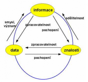 Vzájemná souvislost mezi data, informace, znalost může být pochopena tak, že data jsou shodně vyjádřené symboly představující "výrobní surovinu", jež se mění na informaci. Znalosti se posléze vymezují jako základní rámec pro kognitivní procesy, jež interpretují data a informace.[2]