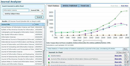 Mimo popisných informací zde nalezneme údaje jako výčet článků, autorů, počtu patentů, zdrojů, ve kterých autoři tohoto pracoviště publikují, je zpracována analýza spolupracujících institucí. Na koláčovém grafu je zobrazeno rozvržení činnosti v jednotlivých vědeckých disciplínách, které lze přepnout na tabulkové zobrazení. Pro analytické zpracování časopisů je k dispozici Journal Analyzer (obr. 3) v části Analytics, pomocí něhož lze časopisy na základě citačních analýz porovnávat.