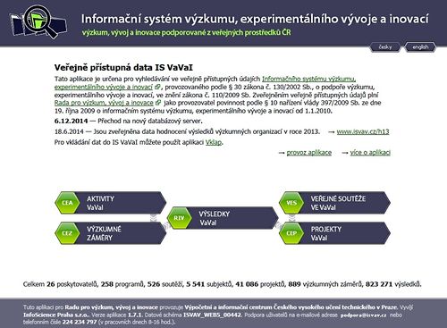 - ↑ RADA PRO VÝZKUM, VÝVOJ A INOVACE, 2014. Informační systém výzkumu, experimentálního vývoje a inovací: výzkum, vývoj a inovace podporované z veřejných prostředků ČR [online]. Praha : Výpočetní a informační centrum Českého vysokého učení technického v Praze, [cit. 2014-12-23]. Dostupné z WWW: <http://www.isvav.cz/>.