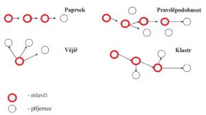 Podle hierarchie v organizacích mohou dotyční sbírat informace a předávat je dál, nebo zpětně reagovat. Podle toho lze sestavit druhy neformálních komunikačních schémat či sítí, které jsou graficky znázorněny ve tvaru hroznu (viz obrázek 1).[1][3]