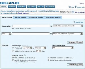 obr. 1: Úvodní obrazovka databáze Scopus s rozhraním jednoduchého vyhledávání (zdroj: www.scopus.com)
