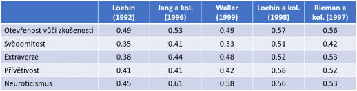 Jako nejvíce geneticky podmíněné se ukazují extraverze, otevřenost vůči zkušenosti a neuroticismus. Naproti tomu přívětivost a svědomitost patří k osobnostním rysům, které lze ve větší míře ovlivnit prostředím. Vysoká míra dědičných předpokladů u otevřenosti vůči zkušenosti může být rovněž dáno tím, že tato charakteristika bývá dávána do souvislosti s inteligencí, jež patří, za určitých podmínek, mezi osobnostní charakteristiky s největším podílem dědičnosti.[4][10]