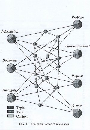 Na obr. na modelu S. Mizzara[5] jsou zástupci první skupiny nalevo a druhé skupiny napravo. Relevancí pak rozumíme vztah mezi dvěma prvky z každé skupiny, např. mezi dokumentem a požadavkem, nebo mezi informací a informační potřebou.[6]