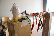 12. Zapojení jednoho konce drátových propojek do každé chilli papričky (z vrchu) a druhého konce do portů 2-9 na Arduinu. Pro vytvoření co nejdelšího “kabelu” použity vždy dvě drátové propojky spojené jedním ”krokodýlkem”.