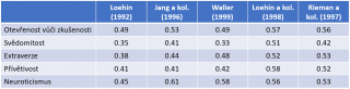 Tabulka dědičnosti jednotlivých faktorů Big Five, dle různých studií, převzatá z The Cambridge Handbook of Personality Psychology.