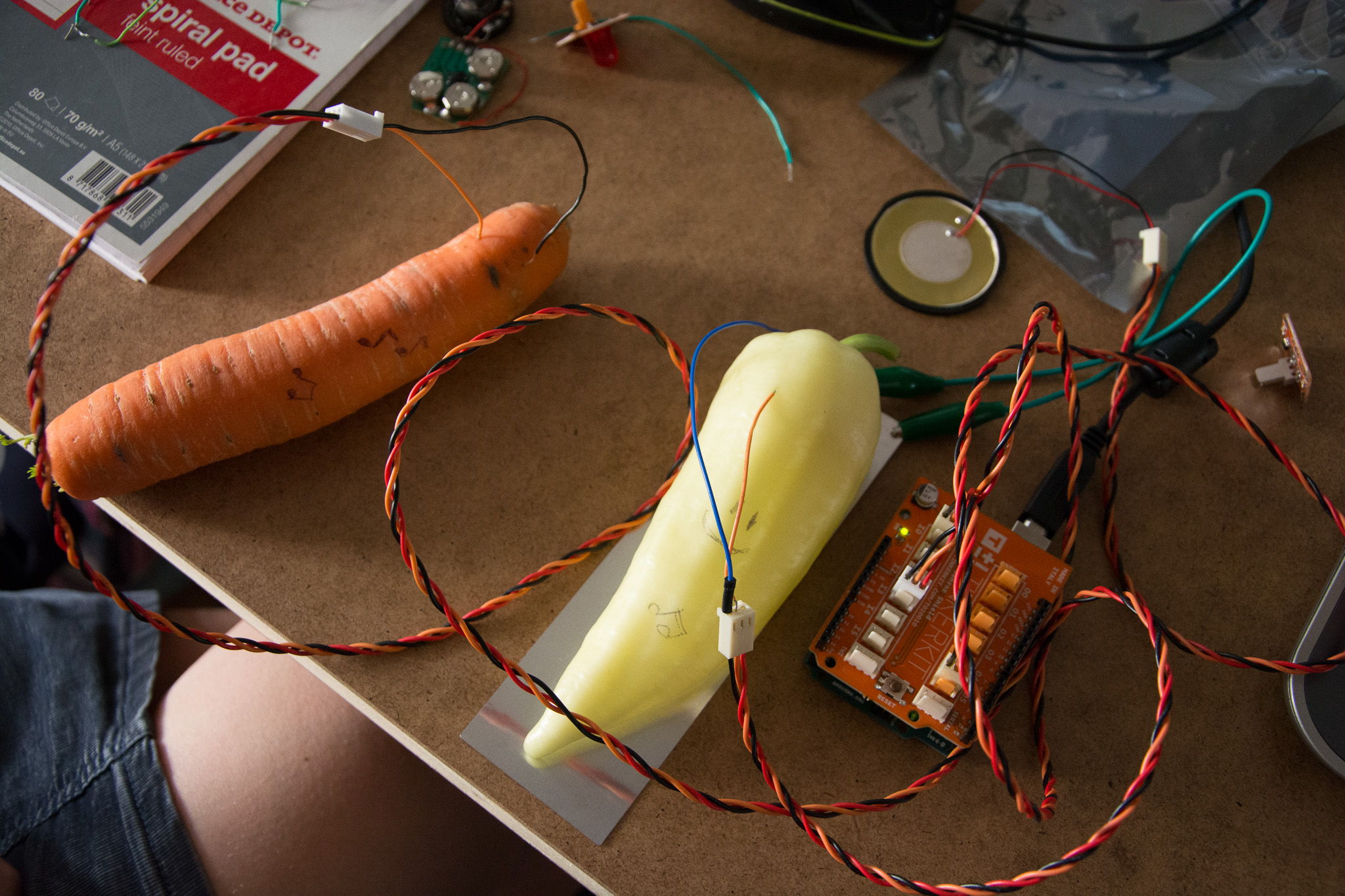 Zapojená mrkev a paprika, při dotyku lidské ruky se zeleninou je možno měřit odpor