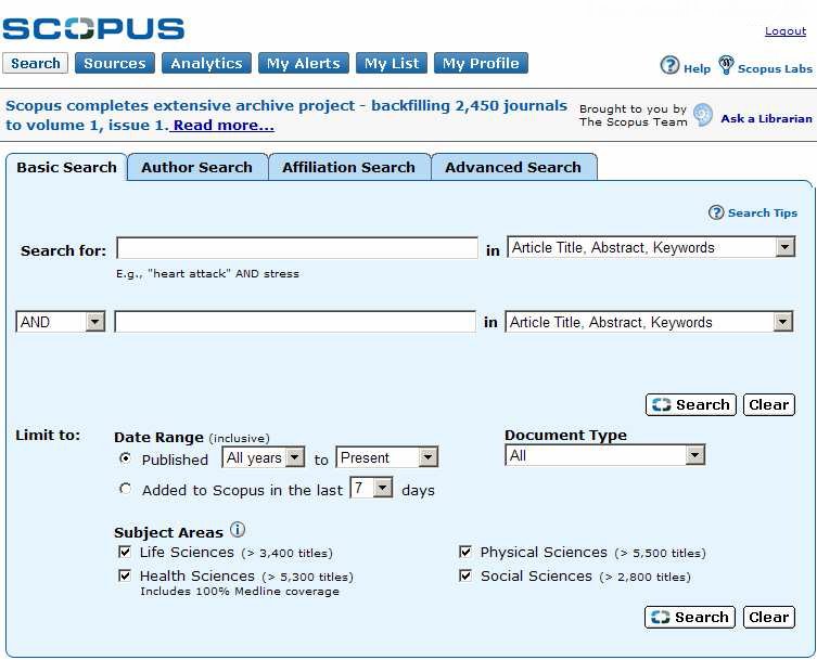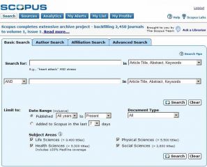Úvodní obrazovka databáze Scopus s rozhraním jednoduchého vyhledávání (zdroj: www.scopus.com)