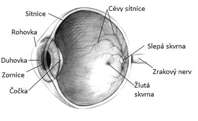 Oko se skládá z rohovky, čočky, duhovky, sítnice, zornice, nervů a cév. Zevnitř je oko vyplněno sklivcem. Duhovka je sval, který reflexivně a plynule mění průměr zornice, čímž reguluje množství světla, které do oka vstupuje. Když světlo vstoupí rohovkou a zornicí do oka, láme se na čočce, a poté dopadá na sítnici, kde stimuluje fotoreceptory. Jde o tyčinky, které jsou citlivé na světlo a čípky, které jsou citlivé na barvy. Čípky dokáží vnímat pouze tři barvy, a to fialovou, zelenou a červenou, přičemž spektrum barev, které dokážeme vnímat, vzniká kombinací těchto barev. Čípky se nalézají hustě v tzv. žluté skvrně, dále od ní jich ubývá a naopak přibývá tyčinek. Signál z fotoreceptorů poté nervy putuje do mozku, kde je zpracován. V místě, kde zrakový nerv opouští oční bulvu, resp. lebeční očnici, je tzv. slepá skvrna. Z každého oka jde nerv do pravé i do levé poloviny mozku. Středové nervy se setkávají v oblasti chaismatu a poté pokračují do příslušných oblastí talamu, odkud putují do mozkové kůry, kde jsou zpracovány za pomocí znakových detektorů – nervových buněk, které reagují na určité zrakové podměty.