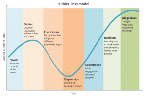 Tento model vznikl původně jako model vyobrazující pět fází smutku. Zobrazuje fáze, kterými prochází lidská psychika při obdržení špatné zprávy. Model byl uveden v roce 1969 americkou psycholožkou Elisabeth Kübler-Ross, jako psychologická příprava na umírání.[4] Nicméně je možné vztáhnout tento model k reakci na změnu. Zachycuje individuální reakci a může být použit, jako podklad pro zpracování dobré strategie pro komunikaci změny. Také má samozřejmě svá omezení, jako je například nevyobrazení a následně těžké určení přechodových bodů jednotlivých fází.